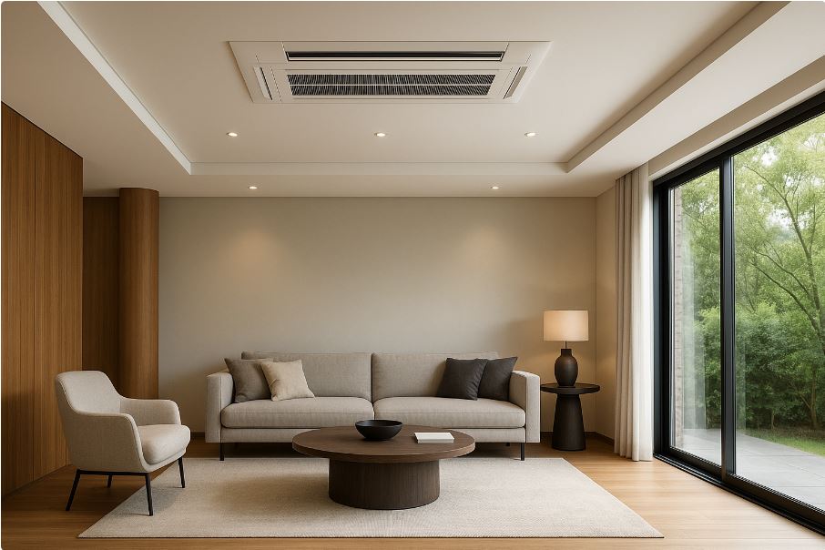 吊隱式冷氣最大的優勢就是 隱藏式設計。冷氣主機安裝在天花板內部,室內僅留出風口與迴風口,讓牆面保持乾淨俐落。這樣的設計不僅不會破壞室內風格,還能與現代簡約、北歐風或豪宅裝潢相互呼應,提升空間質感。