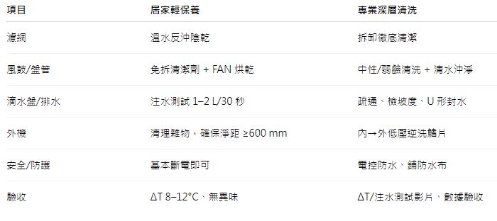 驗收檢測:出回風溫差(ΔT)應維持 8–12°C,運轉 20 分鐘內 無霉味、無滲漏。
