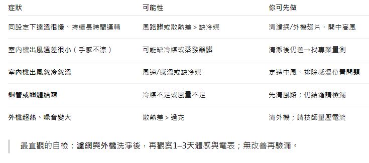 - 新機短期變不冷:多半是安裝/接頭問題,屬施工瑕疵,找原安裝商處理。