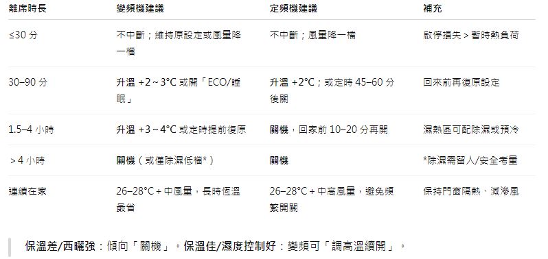 因此是否「一路開著」更省,得看你離開多久、空間保溫如何、濕度與機種。