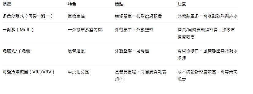整棟冷氣系統的重點不是多裝幾台,而是分區控溫+良好散熱與排水+與換氣/除濕策略協同,才有真正的舒適與省電。