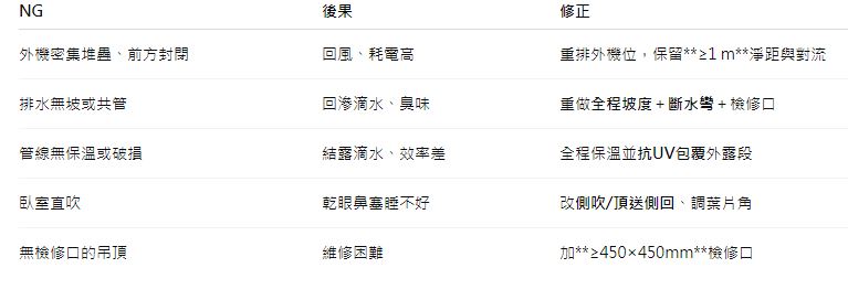 - 外機位:淨距≥1 m、避免「井」型回風;排水有坡度與防回臭斷水彎。