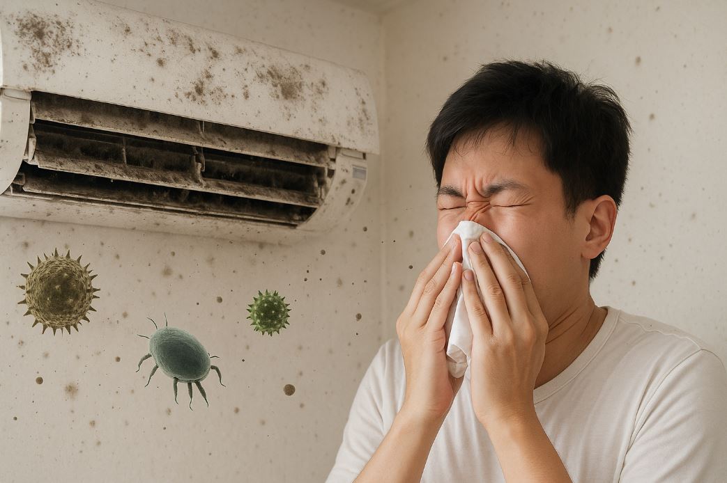 台灣氣候潮濕悶熱,是黴菌與塵蟎的溫床。冷氣內部的冷凝水盤、風鼓與銅管在運轉後往往殘留水氣,若未清理,容易滋生細菌、黴菌與黴斑。當冷氣再次運轉時,這些微生物會被風吹散至室內空氣中,形成所謂的「冷氣病」來源之一。常見症狀包含喉嚨乾癢、鼻塞、打噴嚏、眼睛癢等過敏反應,對小孩、長輩或氣喘患者影響尤為明顯。