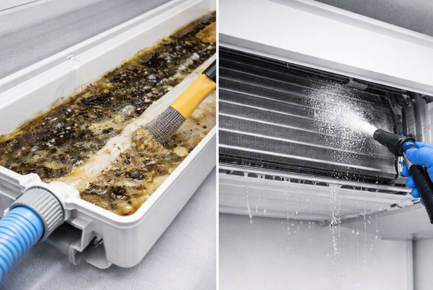 簡單表面可自行清潔,但若滴水嚴重或排水盤積泥黴垢厚,建議請專業深洗更安全有效。