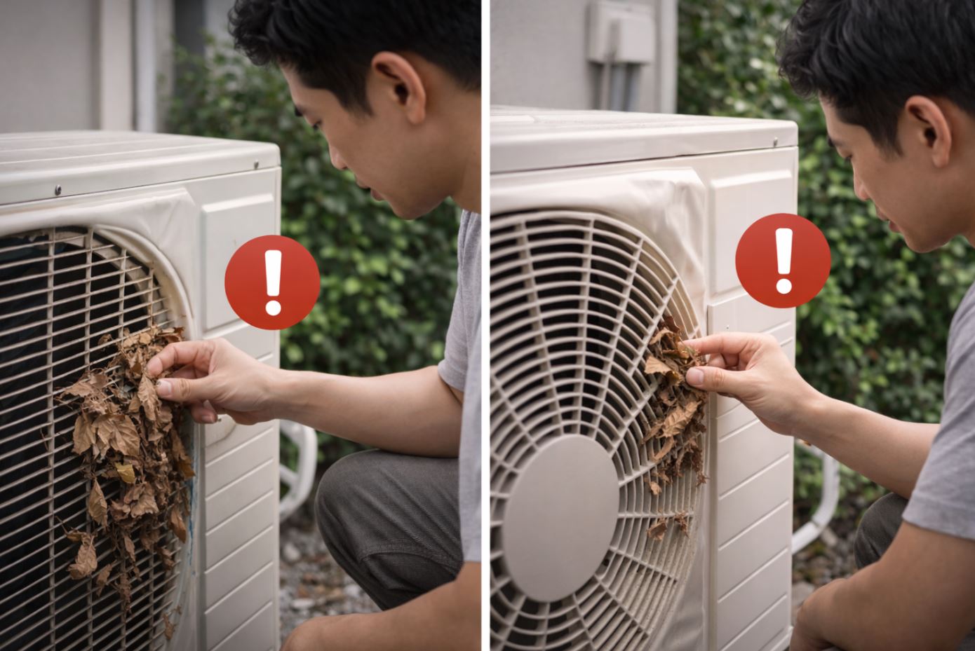 熱氣困在原地 → 室外機更熱 → 冷氣效率大幅下降
