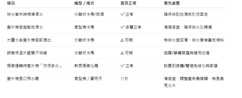 - 室外機本體出水:少見,通常是雨水、管路結露或外殼凝水,需再查來源。