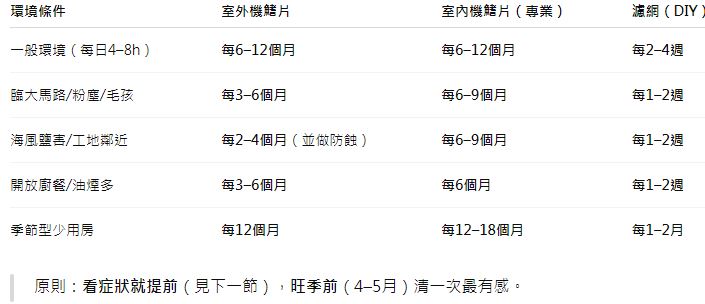 依環境設定6–12個月的外機清洗節奏、6–12個月的室內盤管深洗,再把濾網2–4週的日常清潔與送風烘乾養成習慣,你就能穩住涼得快、味道少、電費省、壽命長的四大目標。