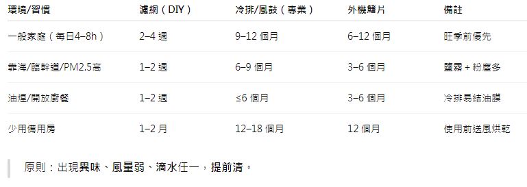 一般家用9–12個月;靠海/臨幹道或油煙重者6–9個月,有症狀就提前。