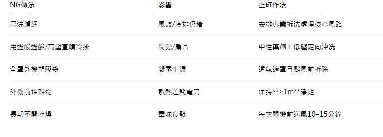 仍有霉味/風弱/滴水,代表風鼓與冷排已積垢,需專業拆洗。