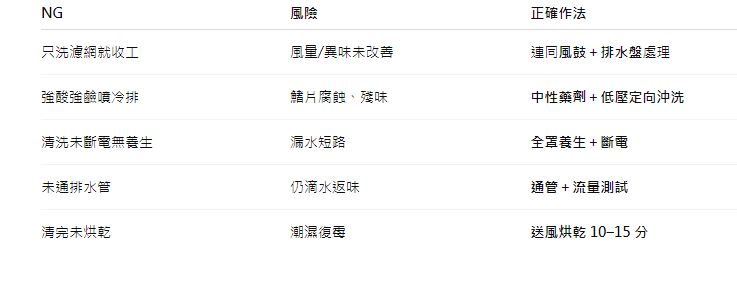 - 濕氣排除:排水盤與管路通暢 → 凝結水不滯留 → 霉味減少、氣流更穩定。