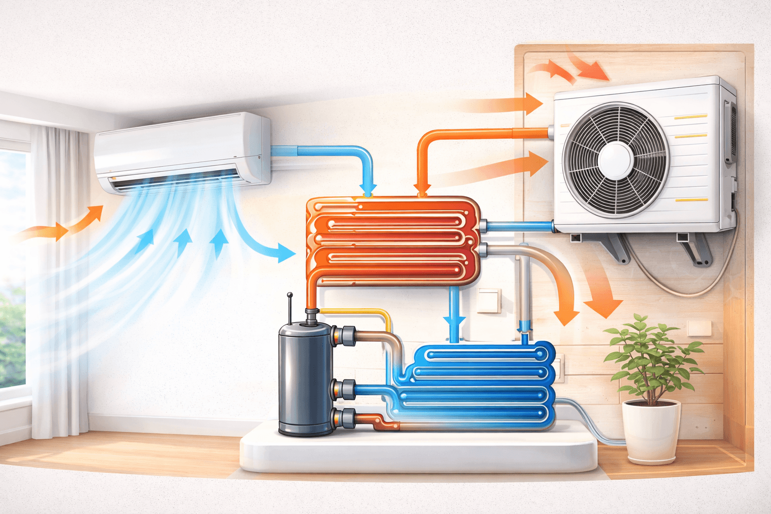 冷氣是透過冷媒循環吸收室內熱量,再把熱排到室外,不是直接製造冷,而是把熱搬走,讓室內溫度下降。